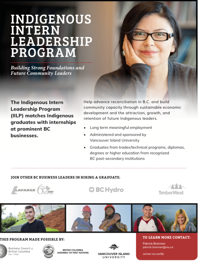 The Indigenous Intern Leadership Program, made possible by the BC Assembly of First Nations and the Business Council of British Columbia through their joint Champions Table, brings together qualifying recent Indigenous Graduates with BC employers for two-year work opportunities.