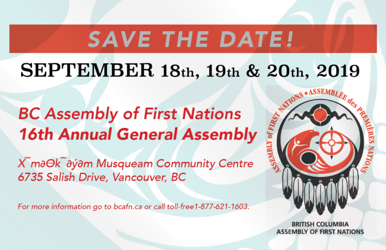 The BC Assembly of First Nations (BCAFN) will be hosting the 16th Annual General Meeting on September 18, 19 & 20 in the Gymnasium at the Musqueam Community Centre in Vancouver, BC.