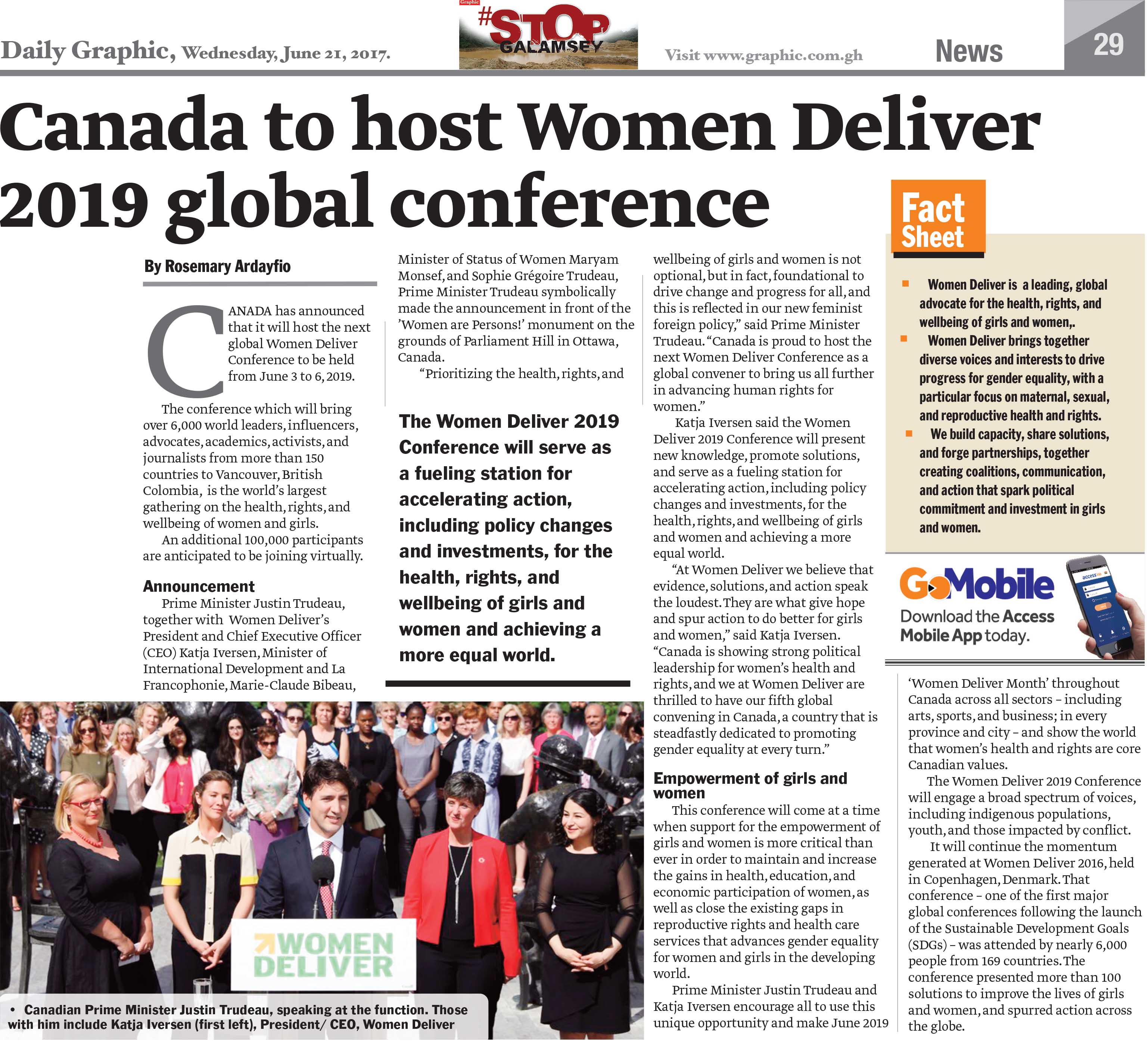 The Women Deliver 2019 Conference will take place 3-6 June 2019 in Vancouver, Canada and will be the world’s largest conference on gender equality and the health, rights, and wellbeing of girls and women in the 21st century. It will serve as a catalyst for advocates working to achieve a more gender equal world.